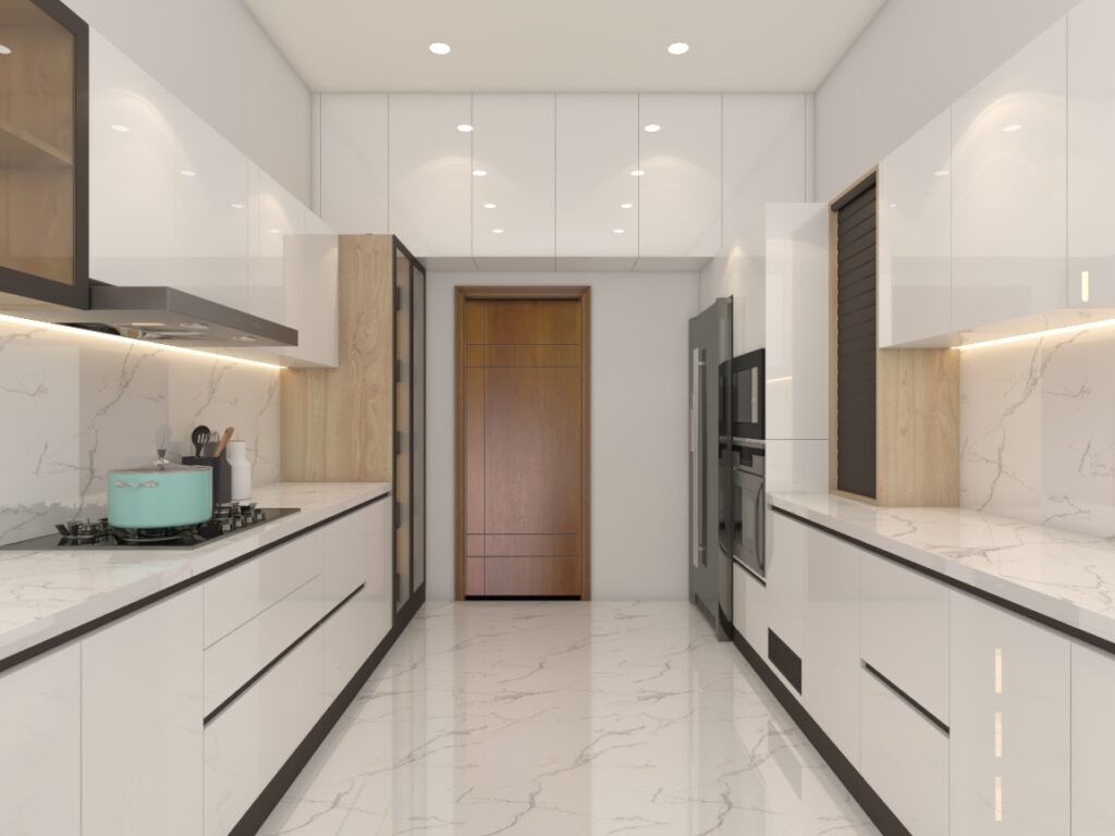 A parallel modular kitchen has cabinets on two opposite walls, making it ideal for compact but functional kitchens. It offers great storage at an affordable price.